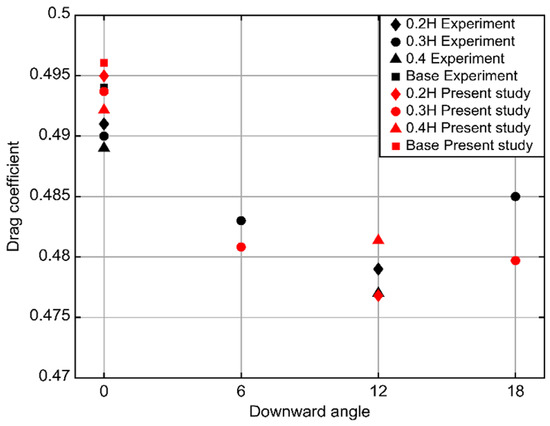 To verify the validity of the simulation model, the drag coefficient was compared with the wind tunnel test results of Ha et al. [7]. They installed a rear flap on a pickup truck and derived the drag reduction by conducting a wind tunnel test and numerical analysis. Figure 5 shows a comparison of the experimental values with the drag coefficient of the simulation model used in this study. ‘H’ is the flap length, and the downward angle on the x-axis represents the inclined angle of the rear flap. The y-axis represents the drag coefficient. The black symbols are the experimental values, whereas the red symbols are the results of the simulation model used in this study. The error was less than 1% in all cases, except for the case in which the length of the rear flap was 0.3H and the downward angle was , indicating the validity of the simulation model.