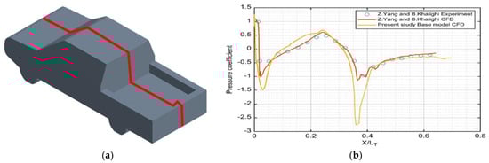 Pressure coefficient in the top section of the pickup truck. (a) Upper center part of pickup truck (b); pressure coefficient at the center of the upper part of the pickup truck [3]. (The red line is the location of the pressure coefficient).