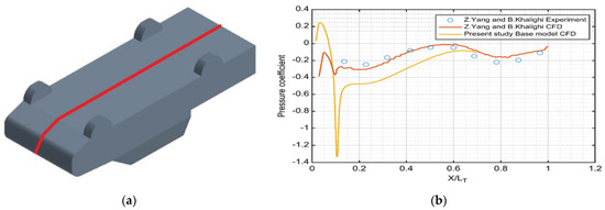 Pressure coefficient in the bottom section of the pickup truck. (a) Bottom center part of the pickup truck; (b) pressure coefficient at the center of the bottom part of the pickup truck [3]. The red line is the location of the pressure coefficient.