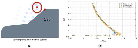 Velocity profile in the height direction at the joint between the windshield and roof. (a) Velocity profile measurement point; (b) velocity profile in the direction of height at point A.