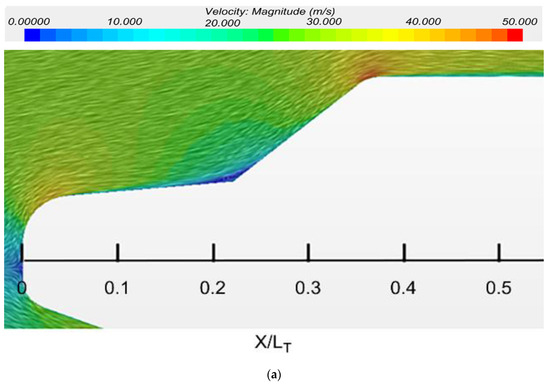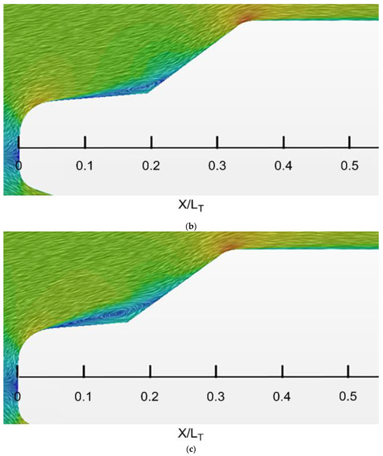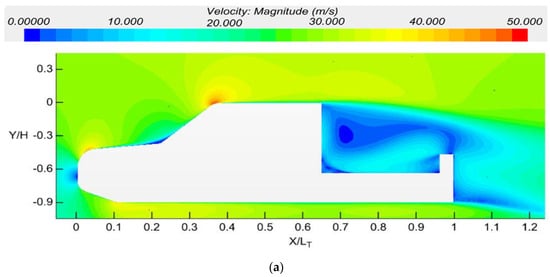 Figure 11 shows the velocity contour according to the rear angle. When the behavior of the fluid was examined for the base model (a) and 1-2 model (c), it was found that the fluid that separated from the cabin flowed toward the tailgate instead of moving in the main flow direction under the effect of the rear angle. In this case, the air stagnation zone in the bed of the pickup truck was larger than that in the base model. The stagnation zone reduced the size of the wake zone above the bed, thereby allowing the fluid to flow in a more stable manner. Therefore, the flow passing over the bed became more streamlined.