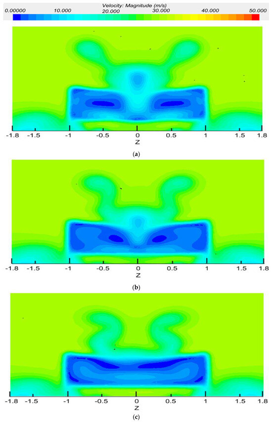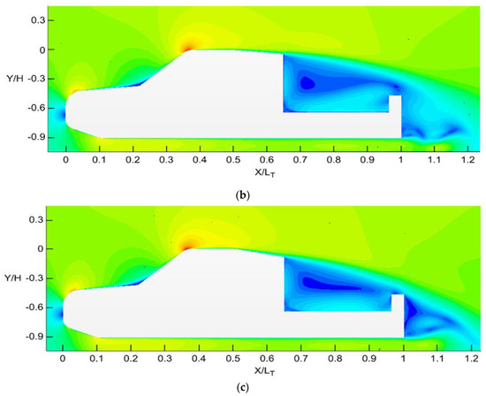 Velocity contour according to the rear angle. (a) Base model; (b) 1-1 model; (c) 1-2 model.