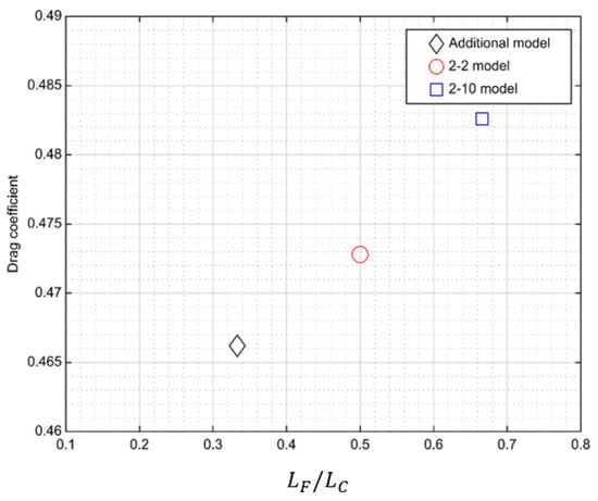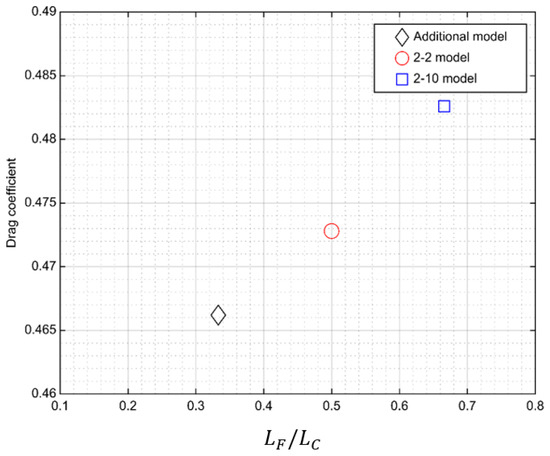 Figure 13 shows the characteristics according to the angle position with a comparison of the drag coefficients at different positions where the roof angle changes. An additional model was introduced to closely observe the change in flow according to the angle position. The additional model, 2-2 model, and 2-10 model had the same overhang length, front angle, and rear angle. The angle position, however, was the 1/3 point from the front for the additional model, the center of the roof for the 2-2 model, and the 2/3 point from the front for the 2-10 model. Compared with the additional model, the drag coefficient increased by 1.4% for the 2-2 model and by 3.5% for the 2-10 model. The drag coefficient of the model tended to be smaller when the angle position was closer to the front.