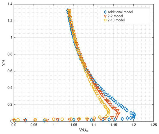 In general, when a separation point exists in the rear part of the geometry, the drag tends to decrease further owing to an adverse pressure gradient behind the geometry. However, the above drag coefficient values showed opposite results due to the influence of the momentum caused by the velocity. Figure 14 shows the velocity profile in the Y-direction at the angle position. Among the models compared, the additional model showed the highest maximum velocity at the same Y position, followed by the 2-2 and 2-10 models. In terms of geometry, the 2-10 model had the flow separation point at the 2/3 point of the roof but exhibited a smaller momentum than the additional model. Therefore, when the angular position is in the front part of the roof, the increase in momentum caused by the velocity has a greater influence on the drag than the position of the separation point.