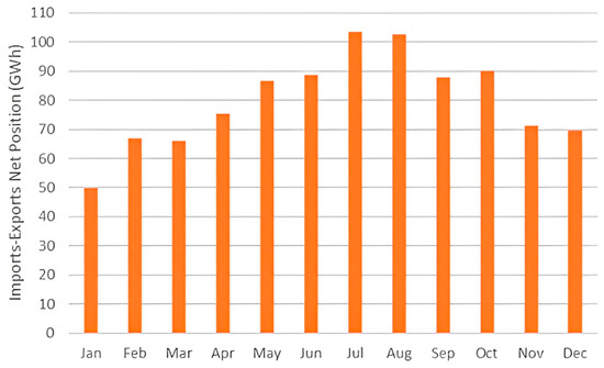 The Greek government’s priority is focused on connecting the unconnected islands in order to reduce energy production costs. Notwithstanding the project’s technical problems, it was intended, in earlier years, to link the island’s electric grid to the mainland’s electric grid via two underwater cables. One cable can carry 150–180 MW, while the other can transport 350 MW. The installation of the smaller cable was completed by the end of 2020, whilst the second was anticipated to be completed by 2023. The net position of 2023 imports–exports is shown in Figure 5: