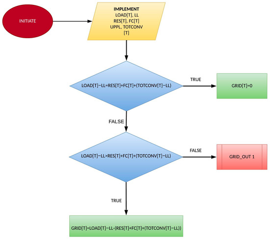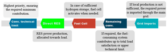 The power dispatch strategy prioritizes grid stability and minimizes reliance on conventional fuels by employing a tiered approach. The priority chain commences by activating only the minimum essential load coverage from conventional power plants, ensuring stable operation while conserving conventional fuel resources. Subsequently, available energy from locally produced RES is directly utilized to meet demand, maximizing the use of clean and sustainable energy. If real-time RES production proves insufficient, the strategy incorporates stored energy, potentially captured from prior periods of high-RES production through electrolysis. This stored energy can be converted for use through fuel cells. In scenarios where demand surpasses both real-time RES production and stored energy capacity, conventional generation is proportionally increased up to their technical limits or until the hourly load is satisfied. As a final resort, if all previous stages are inadequate, a controlled import of energy from the external grid can be implemented, though this option is used sparingly due to potential dependence on external energy sources. The specified priority chain is summarized in Figure 6:
