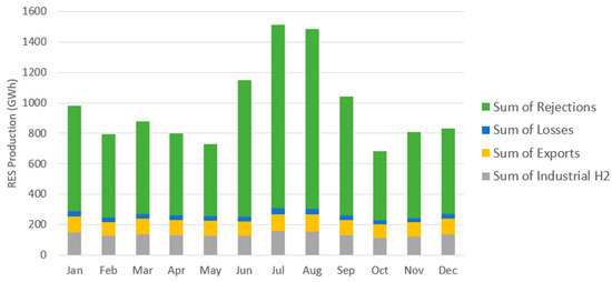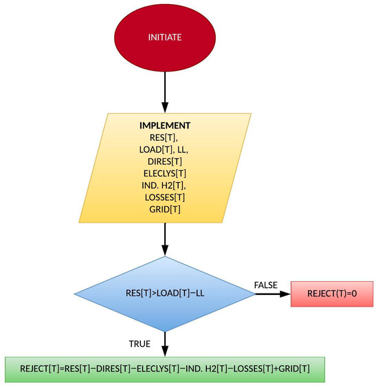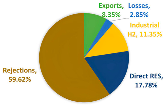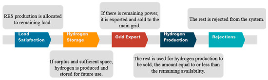 Finally, if a surplus persists after storage and export, the strategy suggests the additional option of hydrogen production for sale, primarily targeting the industrial sector up to the full capacity of the electrolysis system. Any remaining excess production beyond this point is, thus, rejected by the system. The specified process is summarized in Figure 7: