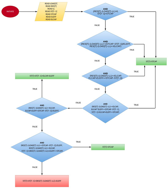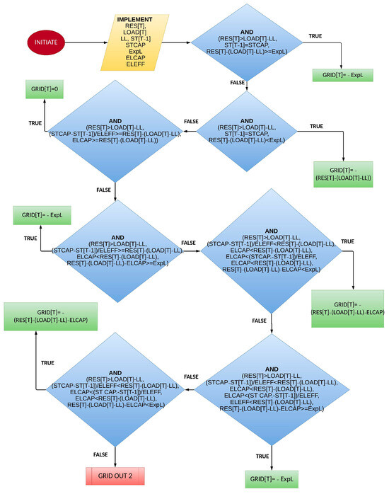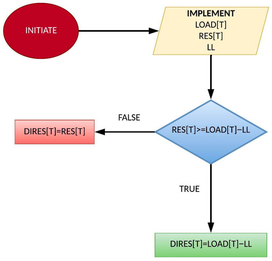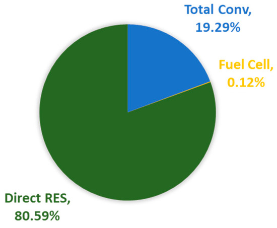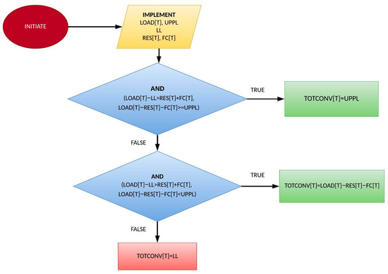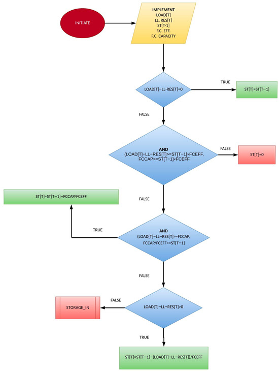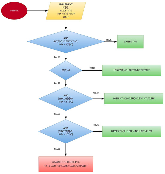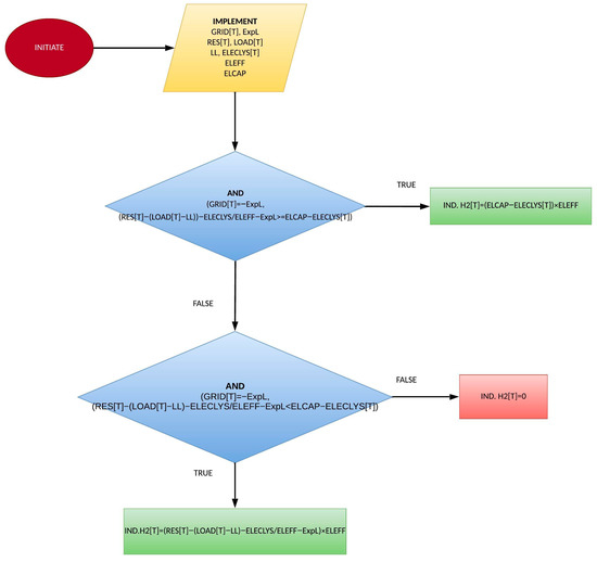 The proposed approach for managing excess RES production exceeding the total hourly load and minimum conventional unit operation requirements employs a multi-step strategy. Firstly, the system prioritizes conversion of any surplus into hydrogen for storage in available tanks through electrolysis. The electrolysis process efficiency is estimated to be around 80% [37]. This approach capitalizes on hydrogen as a viable storage solution, enabling the use of excess RES during low-demand periods. Following hydrogen storage prioritization, any remaining excess beyond the technical minimum and storage capacity is exported to the main grid. This export is limited to a pre-determined value. The export of surplus electric energy through the interconnector is subject to a pre-established nominal value. This value is contingent upon either the interconnector’s maximum load capacity or negotiated power purchase agreements with the relevant electricity provider.