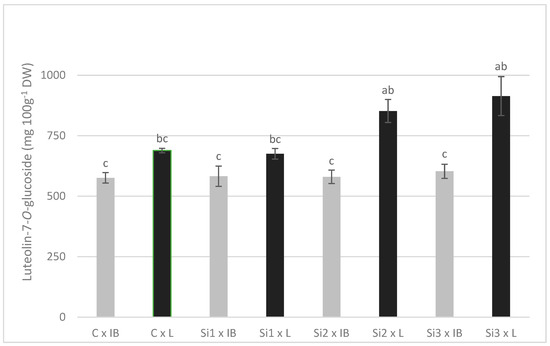 The interaction effects of Si foliar treatment and cultivar on the content of luteolin-7-O-glucoside in olive leaves. Different lowercase letters represent statistically significant differences between mean values at p ≤ 0.05 obtained by a two-way ANOVA and Tukey’s test.