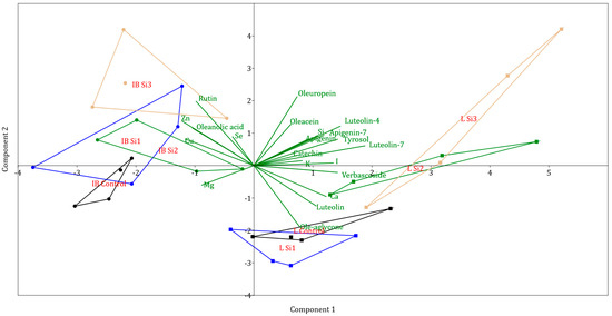 Parameters of principal component analysis (PCA) for two olive cultivars (IB, L) under different levels of Si foliar application (Si1, Si2, Si3) based on polyphenol and mineral content.