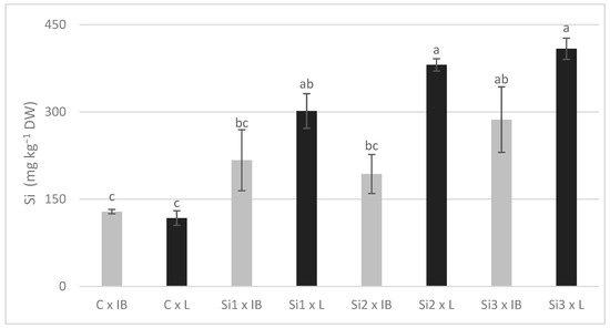 The interaction effects of Si foliar treatment and cultivar on Si content in olive leaves. Different lowercase letters represent statistically significant differences between mean values at p ≤ 0.05 obtained by a two-way ANOVA and Tukey’s test.