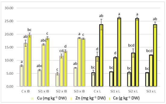 Interaction of Si foliar treatment and cultivar on Cu, Zn, and Ca content in olive leaves. Different lowercase letters represent statistically significant differences between mean values, for each variable (Cu, Zn, Ca), at p ≤ 0.05 obtained by a two-way ANOVA and Tukey’s test.