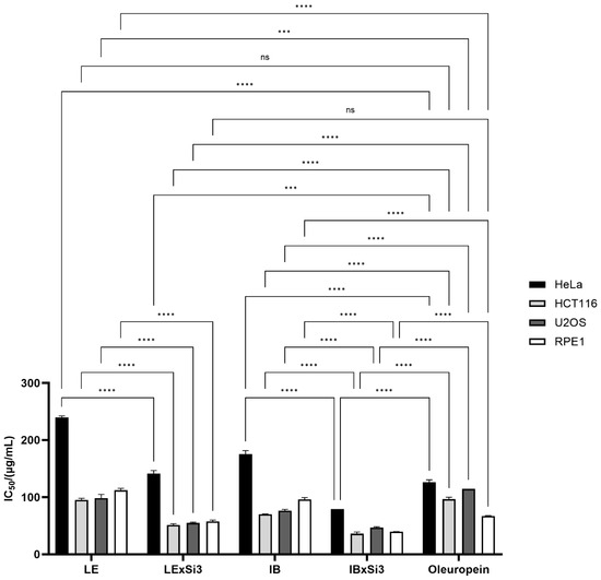Cytotoxic activity of extracted polyphenols from non-Si treated Leccino and Istarska Bjelica plants (LE and IB), Si-treated Leccino and Istarska Bjelica plants (LExSi3 and IBxSi3), and oleuropein on HeLa, HCT116, U2OS, and RPE1 cell lines as assessed by the MTS cell proliferation assay. IC50 values are means of three independent experiments, and SE values are labelled as error bars. Statistically significant differences are marked with *** p < 0.001 and **** p < 0.0001.
