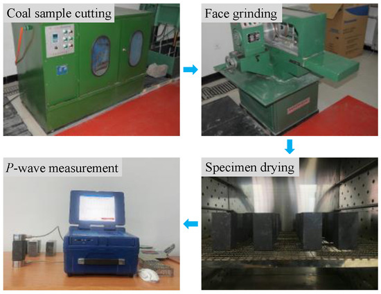 In the test, the coal was collected from the coal and gas outburst mine with a serious rockburst in the No.3 coal seam. More specifically, the coal used in this test was collected from the coal mining working area in Section II, Floor III, Area III–IV, Level III of the No.3 coal seam. According to the determination method of physical and mechanical properties of coal and rock (GB/T 23561.9-2009 [28]), in combination with the characteristics of the test equipment, the specimen preparation size was determined to be 100 mm × 50 mm × 50 mm. Considering the development of pores and cracks in the raw coal, the internal damage state of specimens varied after preparation, which led to significant differences in their mechanical properties, thus affecting the regularity analysis of the test results. To ensure the reliability of the research on the outburst–rockburst coupling disaster law, an ultrasonic measurement test of coal specimens was carried out. The P-wave of coal specimens was measured with the Sonic Viewer-SX ultrasonic measurement system (OYO Company, Tokyo, Japan) to explore the damage state of these specimens. The P-wave velocity mainly ranged from 1900 m/s to 2100 m/s. After the specimens with large dispersions of wave velocity were eliminated, the coal specimens with similar mechanical properties were obtained to conduct true triaxial single-sided unloading mechanical tests. The ultrasonic measurement process of the specimens is shown in Figure 1.