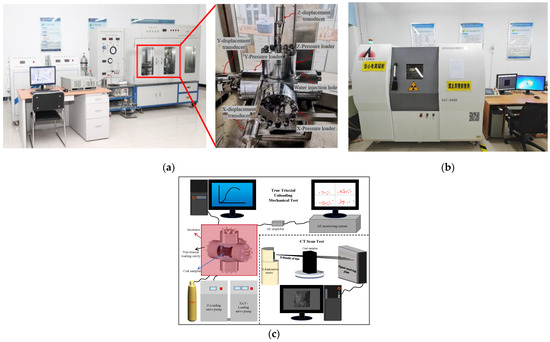 To restore the complex stress state, gas, and temperature environments of the coal body in outburst–rockburst coupling disasters, a true triaxial solid–thermal–gas coupling test device was adopted for the mechanical test. As shown in Figure 2a, the test device was composed of six components: a gas flow loading system, a double-cylinder servo loading system, a true three-axis clamping system, a temperature control system, an acoustic emission monitoring system, and a real-time data acquisition system [29]. This device can be employed to simulate the three-dimensional unequal stress loading of the coal body, with the maximum stress being 80 MPa, the maximum temperature being 85 °C, and the gas pressure being 10 MPa. Through this device, the true occurrence environment of the coal body can be restored to the greatest extent, and the occurrence process of outburst–rockburst coupling disasters can be reproduced. Acoustic emission monitoring technology can be utilized to reveal the energy release law and the damage and fracture mechanism of the coal body [30,31]. To explore the mechanism of outburst–rockburst coupling disasters, the SH-II acoustic emission system (PAC, Newark, NJ, USA) equipped with the Nano30 probe (PAC, Newark, NJ, USA) was used to collect acoustic emission signals during the single-sided unloading of coal specimens in real time. Given the crack evolution in the coal body as the root cause of the disaster, ICT-3400 industrial CT (Dandong Aolong Ray Instrument Group Co., Ltd., Dandong, China) was adopted to scan the meso structure of coal specimens, with the minimum spatial resolution being 5 μm, the DR sensitivity being 0.8–1.2%, and the maximum energy of high-frequency X-rays being 225 kV. CT scanning can convert the optical signals carrying X-ray attenuation information into electrical signals to form grayscale images [32,33] and characterize the distribution of meso crack structures in coal specimens in the form of two-dimensional slices.