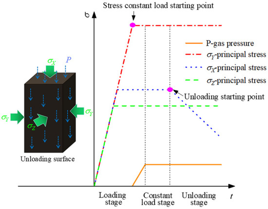 In this study, four main disaster factors in the working area were selected to perform experimental research, including the crustal stress in the coal seam, gas pressure, temperature, and excavation unloading conditions. A total of 5 groups of true triaxial single-sided unloading mechanical tests under different gas pressures (0.6 MPa, 0.9 MPa, 1.2 MPa, 1.5 MPa, and 1.8 MPa) were conducted by using the control variable method, and the three-dimensional stress, temperature, and excavation unloading conditions were kept unchanged during these tests. The three-dimensional principal stress was σX = 20 MPa, σY = 35 MPa, and σZ = 18 MPa, and the temperature was 35 °C. The unloading condition of the coal mining excavation was realized by unloading the left end face in the X direction at 0.06 MPa/s. The stress loading path of the outburst–rockburst coupling disaster tests is shown in Figure 3.