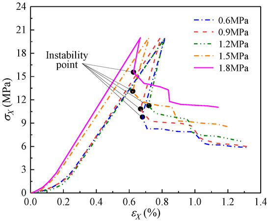 Five groups of typical specimens under different gas pressures were selected to plot the whole stress–strain curve in the unloading direction, as shown in Figure 4. As can be seen from the figure, there were two sudden drops in the stress in the stress–strain curves of all five groups of outburst–rockburst coupling disaster tests with different gas pressures. However, the strain at corresponding moments exhibited two patterns. When the gas pressure was 0.6 MPa and 0.9 MPa, the strain produced under the first sudden stress drop was smaller than that under the second one. However, when the gas pressure was 1.2 MPa, 1.5 MPa, and 1.8 MPa, the strain produced under the first sudden stress drop was larger than that under the second one. During these tests, many bubbles were observed in the bubbling water at the gas outlet of the device during the two sudden stress drops. This suggested that the structural instability of specimens was accompanied by abnormal gas emission during the two sudden stress drops. When the gas pressure was 0.6 MPa and 0.9 MPa, the instantaneous gas emission volume and velocity during the second sudden stress drop were higher than those during the second one. When the gas pressure was 1.2 MPa, 1.5 MPa, and 1.8 MPa, the instantaneous gas emission volume and velocity during the first sudden stress drop were higher than those during the second one, but the instantaneous gas emission volume decreased significantly after an instant. In summary, when the gas pressure was 1.2 MPa, 1.5 MPa, and 1.8 MPa, the first sudden stress drop contributed to the “small structure” instability failure under the action of gas, namely the coal and gas outburst, while the second one contributed to the “large structure” instability failure under the action of three-dimensional stress, namely the rockburst.