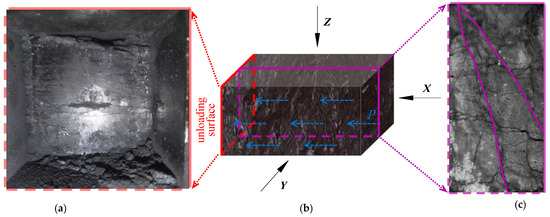The internal meso structure of the No.2 coal specimen with an initial gas pressure of 1.8 MPa was scanned by industrial CT, as shown in Figure 5. Figure 5a shows a physical diagram of the failure mode on the unloading surface of the specimen. As can be seen from the figure, there was an obvious “triangular” crushing opening with a large cross-section in the upper right corner of the unloading surface, and an “oval” crushing opening was also observed in the middle of the specimen. Additionally, small coal fragments and many powdery coal particles were distributed in a disorderly manner in front of the crushing opening. Combined with the gas pressure changes during the sudden stress drops in the test process, the “small structure” instability failure (coal and gas outburst) was identified during the first structural instability failure. In Figure 5c, there is a V-shaped main crack in the specimen, which was formed by the penetration of many cracks. Meanwhile, there were many small cracks around the crack extension direction, which indicated that before the rockburst, the main crack development area had been damaged under crustal stress and gas deterioration. The coal and gas outburst resulted in the rapid development of cracks in the coal body, which reduced the bearing capacity of the specimens. Under the action of crustal stress, the further extension and penetration of cracks led to rockburst. Therefore, the essential mechanism of the outburst–rockburst coupling disasters can be explained that under the synergistic action of crustal stress and gas, the initial gas in the coal seam exerted a deterioration effect on the coal body, which contributed to the further development of cracks in the coal body, thus reducing its bearing capacity. Finally, the coal body system became completely unstable under the disturbance of mining, resulting in outburst–rockburst coupling disasters.