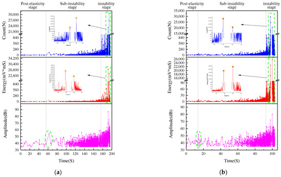 During acoustic emission data processing, it was found that the evolution law of the acoustic emission parameters was highly consistent with that of the gas pressure. Hence, the acoustic emission data of two classical coal specimens were selected for further analysis. According to the changing trend of acoustic emission count, energy, and amplitude of the coal specimens with time during unloading, the acoustic emission signal can be divided into three stages, namely the post-elasticity stage, sub-instability stage, and instability stage. Figure 6 shows the curves of the acoustic emission time domain parameters and time of two groups of coal specimens under different gas pressures in outburst–rockburst coupling disaster physical tests. Figure 6a shows the acoustic emission time domain parameter curve of the No.5 coal specimen under an initial gas pressure of 0.6 MPa, and Figure 6b shows the acoustic emission time domain parameter curve of the No.2 coal specimen under an initial gas pressure of 1.8 MPa. It can be seen from the figure that after the initial gas pressure increased from 0.6 MPa to 1.8 MPa, the data volume of acoustic emission time domain parameters in the post-elasticity stage increased significantly. This was due to the following: with an increase in the gas pressure, the deterioration of gas in the specimen became more intense, and the free gas content also increased. Therefore, the continuous action of the deviatoric stress combined with the synergic effect of the energy generated by gas intensified the crack development of the coal specimens. As a result, the data volume of the acoustic emission time domain parameters exhibited an increasing trend.