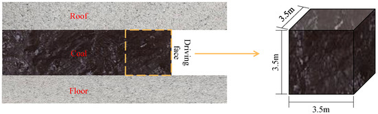 The simulation engineering background involved an outburst–rockburst coupling disaster in Mine XII of a mining group. The disaster occurred at Level 3, Mining Area VII of the No.15 coal seam with a buried depth of 1100 m. The No.15 coal seam was a coal seam with coal and gas outburst, with the gas pressure reaching as high as 2.85 MPa and the average thickness of the coal seam being 3.5 m. The maximum horizontal stress and vertical stress of the coal seam measured on site were 30.02 MPa and 40.16 MPa, respectively. The average thickness of the coal seam (3.5 m) was selected as the simulated height of the model, the actual laneway size (3.5 m) was selected as the simulated width, and the depth from the working face (3.5 m) was selected as the simulated length. The blasting method was used as the tunneling mode of this tunneling face. Hence, the instantaneous dynamic load was used in numerical simulation to break the original equilibrium state of the system and induce the outburst–rockburst coupling disaster. Figure 7 shows the schematic diagram of the engineering background simulation of the outburst–rockburst coupling disasters.