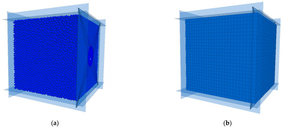 The numerical model diagram of the coal body. (a) Particle model; (b) Fluid grid model.