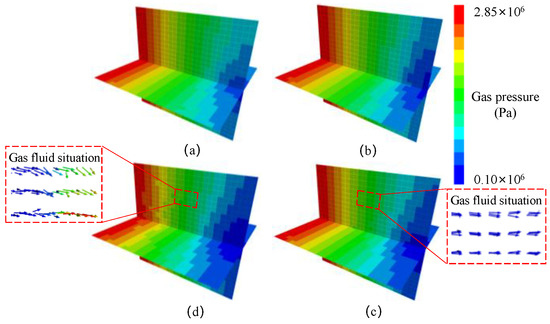 Figure 9 shows the gas pressure distribution nephogram of four typical stages in the preparation and occurrence of the outburst–rockburst coupling disasters. As can be seen from Figure 9a, the gas pressure decreased gradually from the deep coal wall to the outburst opening in the original equilibrium state. When the coal body was subjected to instantaneous disturbance loading, there was no significant fluctuation in the gas pressure in the deep coal body. However, the crack distribution diagram revealed that some tensile cracks and shear cracks were formed in disorder in the coal body. This indicated that the number and size of the cracks in the coal body were small under the action of instantaneous disturbance loading, which exerted little influence on the seepage of gas fluids and thus did not cause a locally high gas pressure. With the outburst opening as the center of the coal wall, several concentric hemispherical gas pressure uniform distribution spaces with an increasing radius were formed. This may be attributed to the development of cracks around the outburst in the coal body under the joint action of instantaneous disturbance loading and gas. Under the influence of pressure gradients, gas flowed along the new crack to the free space outside the outburst opening, which caused this gas pressure distribution pattern.