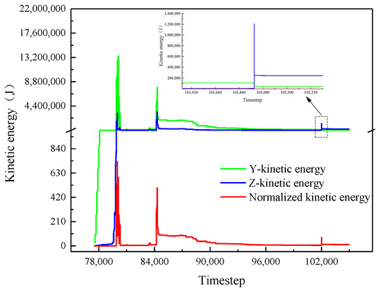 Figure 10 shows the kinetic energy curve diagram of the outburst–rockburst coupling disasters. Since the Y direction was the main action direction of gas, the kinetic energy of the coal body in the Y direction can characterize the coal and gas outburst energy to a certain extent, while that in the Z direction can characterize the rockburst energy to a certain extent. Through the normalized kinetic energy curve, it can be found that the kinetic energy suddenly increased when the simulation calculation steps reached 80,000, accompanied by three peaks in the disaster process. The kinetic energy corresponding to the first two peaks exhibited that the kinetic energy in the Y direction was larger than that in the Z direction. In terms of the kinetic energy corresponding to the third peak, the kinetic energy in the Z direction was larger than that in the Y direction. Hence, it can be judged that the coal and gas outburst occurred in the early stage and the rockburst occurred in the later stage corresponding to the last peak. The quiet period between the first two peaks can be attributed to the high velocity of thrown particles and the boundary being calculated immediately by the model, resulting in a sudden decrease in the kinetic energy. With the continuous development of the outburst, the accumulated gas was rapidly consumed, and the normalized kinetic energy decreased gradually until the occurrence of the rockburst, followed by a sudden increase in the kinetic energy. It can be seen from the diagram that there was a significant difference between the kinetic energy increase and the outburst. This can be explained that the model boundary controlled the displacement of the coal body after the occurrence of instability in the whole structure.