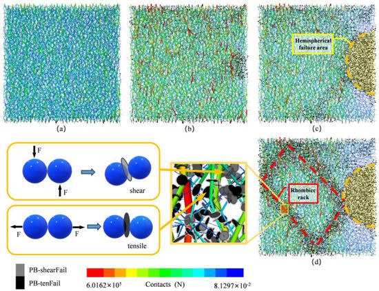 To visually present the evolution process of cracks in the coal body, in the numerical model constructed by PFC3D, the location, color, and inclination angle of circular slices were employed to characterize the cracks in the coal body, and the tensile cracks and shear cracks were characterized by black and gray circular slices, respectively. Figure 12 shows a characteristic diagram of the dynamic evolution process of the coal cracks and force chains in four typical stages during the preparation and occurrence of the outburst–rockburst coupling disasters. As can be seen in the figure, there was no new crack in the coal body in the original equilibrium state, and the distribution of binding force chains showed that the force on the particles in the coal body was uniform. When subjected to instantaneous disturbance loading, relatively concentrated cracks were observed in the upper part of the coal body, and the cracks in the middle and lower parts were sparse and disordered. This indicated that the instantaneous disturbance loading exerted significant impacts on the particles around the upper boundary wall of the model, which destroyed the contact state between particles, thus generating relatively concentrated tensile cracks and shear cracks. Therefore, this result implied that when the force was applied to the weak surface of the coal body, the force on adjacent carbon particles was not uniformly in different directions due to the anisotropy of the weak surface and the lower surface, thus resulting in stress concentration. Hence, the weak surface of the coal body was prone to failure, thus causing system instability. Cracks were also clustered at the outburst opening of the coal body, which can be attributed to disturbance loading. The gas at the outburst opening became active, which promoted the development of these cracks. This further resulted in numerous tensile cracks and shear cracks around the outburst opening, generating relevant conditions for the occurrence of the coal and gas outburst.