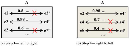 For alignment disambiguation, we apply an approach based on two major steps (Figure 2). First, we go through all the correspondences in the alignment, and we disambiguate each set of ambiguous correspondences having a source entity in common, as shown in Figure 2a; then, we go through all the correspondences again, and we disambiguate each set of ambiguous correspondences having a target entity in common (coming from ), as shown in Figure 2b. In each step, disambiguation consists of keeping the strongest correspondence (i.e., the one with the highest similarity score) from the set of ambiguous correspondences and deleting the rest. If two ambiguous correspondences have exactly the same similarity score, we keep both of them.