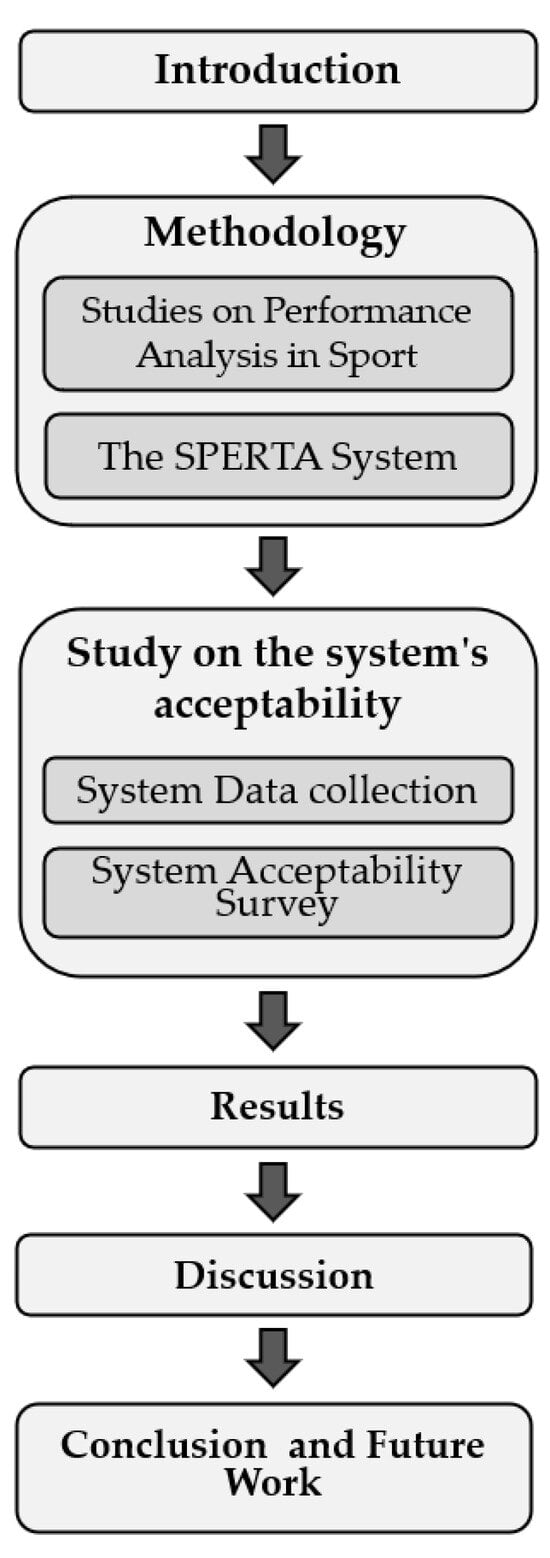 The paper is structured into six chapters, as outlined in the flowchart depicted in Figure 1. In the initial chapter, an introduction and contextualization of the study are provided. The second chapter outlines the methodology employed in the study, highlighting the research conducted on athletic performance analysis and the system created for performance analysis, SPERTA. The subsequent chapter details the study conducted to evaluate the acceptability and usability of the system, discussing the data collection method and the questionnaire used to assess the acceptability of the system. The fourth chapter presents the results obtained from the survey analysis. The fifth chapter involves a discussion of the findings. The final chapter presents the conclusion and outlines future work.