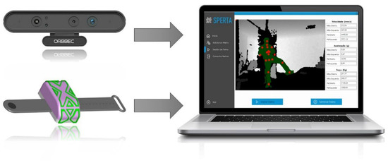 The overall system, developed as part of SPERTA, consists of a 3D camera, the Orbbec Astra with RGB (red, green, blue) and depth sensors [32], inertial measurement units (IMUs) with an accelerometer and a gyroscope, and a computer for data acquisition and processing. This setup makes it possible to obtain detailed information such as the Cartesian coordinates and speed of the hand and foot movements performed by the athletes and to provide coaches with accurate feedback to correct or improve an athlete’s technique by displaying the data in real time.