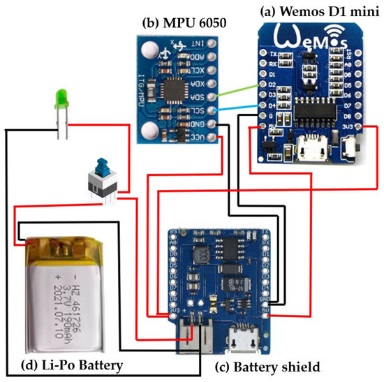 ESP8266-based mini Wi-Fi board (a), accelerometer and gyroscope module GY 521 MPU 6050 (b), power management module (c), and battery (d) connection diagram (red positive, black negative).