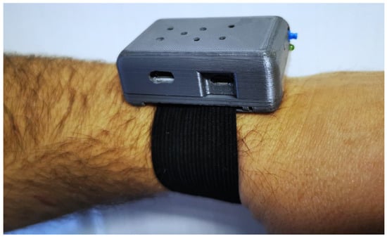 The equipment utilized by athletes comprises a compact board built on ESP8266 with Wi-Fi capabilities, along with an accelerometer and gyroscope module, a battery, and a power management module (Figure 2). To ensure a systematic arrangement of these components, a container was devised. This container is affixed to the athletes’ wrists and ankles using an elastic band equipped with Velcro fasteners (Figure 4 and Figure 5).