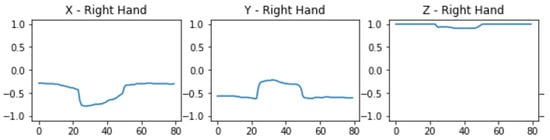 The collected data consist of the values of the Cartesian coordinates of the athletes’ joints, as well as the linear acceleration values of the accelerometer and the angular rotation rate of the gyroscope of the movements performed. So, the input to the deep learning module consists of a set of information on the position of the X, Y, and Z axes (three-dimensional coordinates) of each of the human athletes’ joints, such as knees, ankles, elbows, and wrists. These data are provided by the 3D camera’s depth sensor and developed motion sensors. They are collected by the SPERTA application, developed for the system, which stores them in a database and sends them to the deep learning module to count and identify the athletes’ movements. In Figure 7, a graphical representation of the data that are provided to the deep learning network is presented. The set of frames, the X, Y, and Z coordinates, represents the movement of the right-hand joint during Jirugui movement throughout a sequence of 80 samples. However, to classify the athlete’s movements, data from other joints are considered.