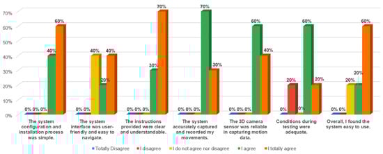 The analysis of the closed-ended responses, which included seven questions, revealed that the category “Totally Disagree” did not receive any responses, while the option “I disagree” obtained only 3% of the responses. On the other hand, the category “I do not agree nor disagree” accumulated 9% of the responses, while the options “I agree” and “I totally agree” received 37% and 51% of the responses, respectively (Figure 9). The analysis of the responses by question revealed that the majority of participants agreed or strongly agreed with the statements presented. For example, 60% of the participants agreed that the system’s configuration and installation process was simple, while 40% strongly agreed with this statement. Furthermore, 70% of the participants agreed that the provided instructions were clear and understandable, and 60% agreed that the system accurately captured their movements (Figure 10).