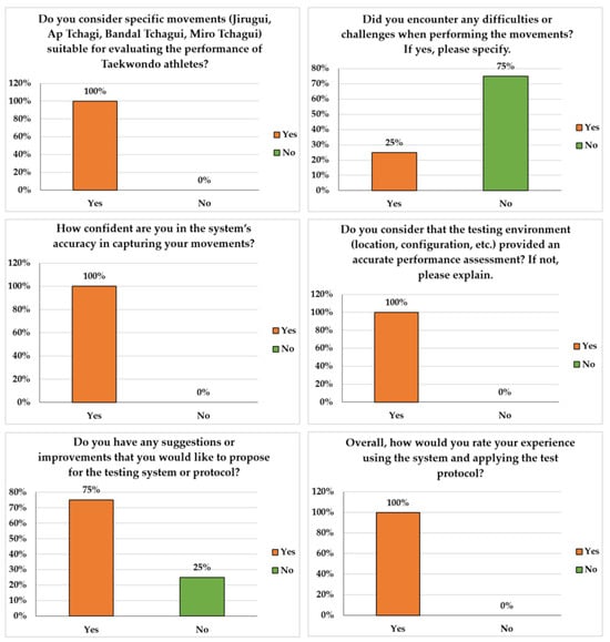 Based on the results obtained in this section of the form (Figure 11), it is feasible to establish the following conclusions. The specific Taekwondo movements evaluated (Jirugui, Ap Tchagi, Bandal Tchagui, Miro Tchagui) were considered suitable by 100% of the participants for assessing athletes’ performance. These movements are fundamental in the discipline and allow for a comprehensive evaluation of athletes’ technical skills. The majority of participants (75%) did not encounter difficulties or challenges when performing the movements with the equipment used. However, some suggested that the equipment be adapted to better fit the arms and legs, and that applying maximum force without a target could be uncomfortable. All participants (100%) expressed confidence in the system’s accuracy in capturing their movements. It is believed that the accuracy will further improve with the continuous development of the program. The testing environment was considered suitable by 100% of the participants, providing appropriate conditions for accurate performance assessment. However, it is suggested that the use of a target bag could further enhance the testing protocol. The majority of participants (75%) proposed improvements, such as more compact and lightweight sensors attached to the extremities to prevent them from coming off during training, and the possibility of using the system in competitive environments. Overall, the experience of using the system and applying the testing protocol was positively evaluated by all participants (100%). The project was considered promising, useful for improving athletes’ performance in various disciplines, and intuitive to use.