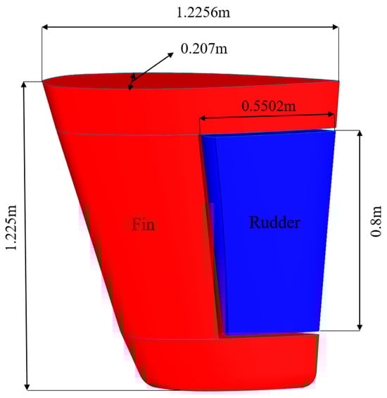 The focus of this study is a fin and rudder, depicted in Figure 1. Unlike a conventional rudder, the fin and rudder examined herein exhibit a greater lift coefficient. Positioned at the trailing edge of the fin, the rudder operates independently through a distinct actuation mechanism. The fundamental geometric measurements of the fin and rudder are detailed in Table 1.
