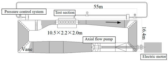 The measurement of hydrodynamic performance and pressure fluctuation can be carried out in a water tunnel for various types of ships and underwater vehicles. The water tunnel used had a total length of 55.00 m and a height of 16.40 m. Figure 3 shows a schematic diagram of the water tunnel. The main parameters of the test section for the current experiment are presented in Table 2.