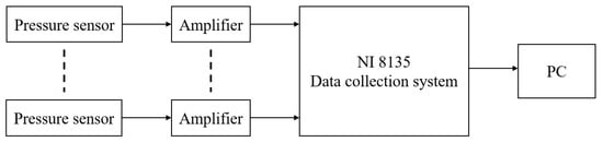A PCB HTM pressure sensor (FLSmidth A/S, Mariager, Denmark) was utilized in this experiment to measure the pressure fluctuation on the surface. The measurement locations on the surface were drilled for sensor installation. The sensor was fixed in place using adhesive, ensuring that the sensor head was flush with the outer surface of the model. The pressure fluctuation signal measured by the pressure sensor in the test was amplified by the filter amplifier. The data were collected synchronously using a real-time signal analysis system. A diagram of the data acquisition system used in the pressure fluctuation test is shown in Figure 4.