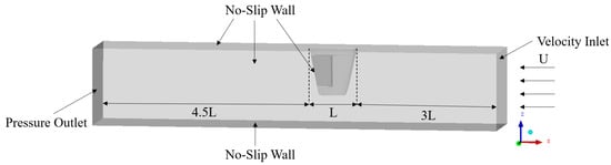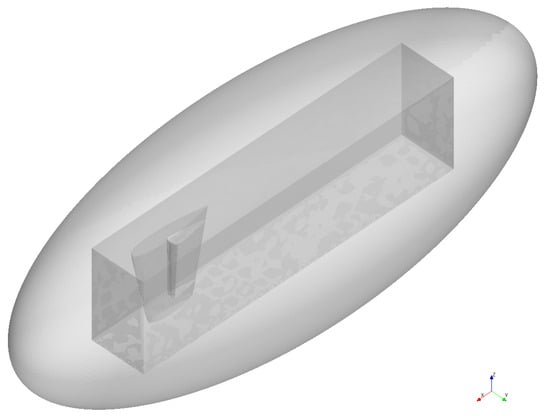 The computational domain was set with reference to the size of the test section of the water tunnel, as shown in Figure 6. Its dimensions were 10.50 m (length) × 2.20 m (width) × 2.00 m (height). The medium in the computational domain was water.