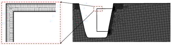 As an example, a midsection view of the medium CFD mesh with a mesh number of 30 million is shown in Figure 8. To better capture the flow characteristics and details of the flow field, mesh refinement is performed in the vicinity of the wall and areas with significant velocity gradient changes, such as the fin and rudder and the gap regions.