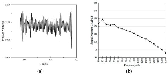 The third-octave spectrum divides the audible frequency range into bands and presents the results of spectral analysis in terms of band energy. Firstly, the center frequency of the third-octave bands is predefined, allowing for the upper and lower band limits of each octave band and the number of spectral lines within each band to be determined. By using Equation (8), the pressure root-mean-square values for different octave bands can be calculated. Applying Equation (9) enables the acquisition of the corresponding sound pressure levels within each octave band. These values are then assigned to the center frequencies of the respective octave bands. Using the obtained frequency domain data, we can construct a spectrum, with the vertical axis representing decibels (dB), resulting in the pressure fluctuation spectrum in the third-octave shown in Figure 10b.