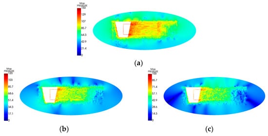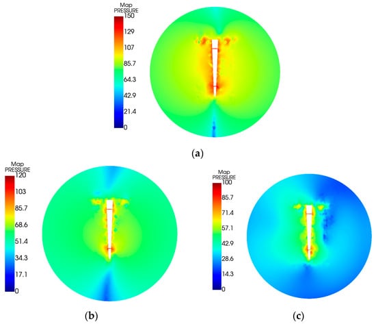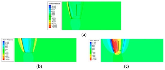 Comparison of the pressure field for different flow velocities in the XY plane: (a) 3 m/s; (b) 5 m/s; (c) 8 m/s.