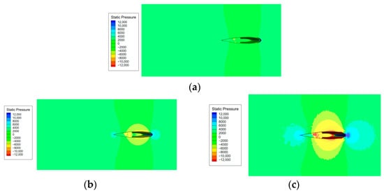 The accuracy of flow field computation is important as it determines the accuracy of subsequent noise calculations. Figure 11 presents the pressure field in the XZ plane for three flow velocities: 3 m/s, 5 m/s, and 8 m/s. Meanwhile, Figure 12 depicts the pressure field in the XY plane. The maximum pressure mainly occurs at the leading edge of the fin and rudder. The minimum pressure occurs on the rear surfaces of the rudder and fin sides. As the inlet velocity increases, the pressure on the fin and rudder gradually increases.