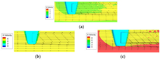 Velocity field and streamline for different flow velocities in the XZ plane: (a) 3 m/s, Re ≈ 3.6 × 106; (b) 5 m/s, Re ≈ 6.1 × 106; (c) 8 m/s, Re ≈ 9.7 × 106.