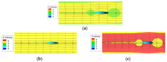 Velocity field and streamline for different flow velocities in the XY plane: (a) 3 m/s, Re ≈ 3.6 × 106; (b) 5 m/s, Re ≈ 6.1 × 106; (c) 8 m/s, Re ≈ 9.7 × 106.