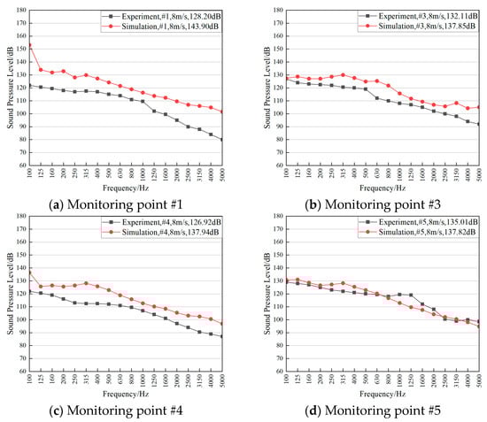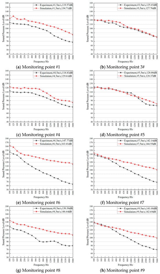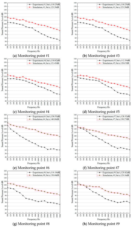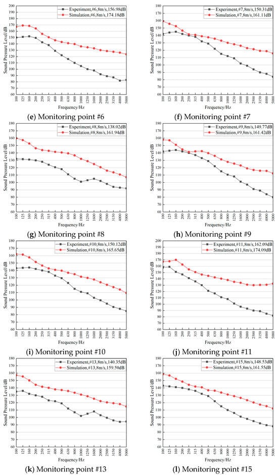 Figure 18 provides a comparison of the pressure fluctuation spectra between the simulation results and the experimental data at each monitoring point for a flow velocity of 8 m/s. In Figure 18a–d, the monitoring points for pressure fluctuation are located on the fin. In the experiment, monitoring point #5 had the highest pressure fluctuation value at 135.01 dB. In the simulation, monitoring point #1 exhibited the highest value at 143.90 dB. Regarding Figure 18e–l, the monitoring points for pressure fluctuations are positioned on the rudder. In the experiment, monitoring point #11 showed the highest pressure fluctuation value at 162.09 dB, while in the simulation, monitoring point #6 showed the highest value at 174.18 dB.