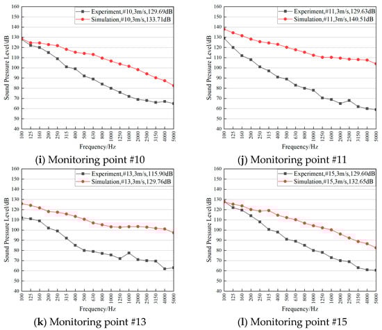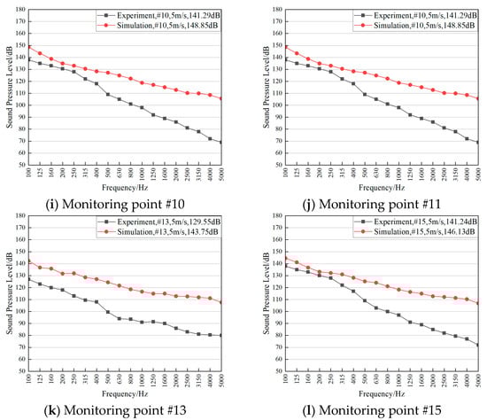 A comparison of the pressure fluctuation spectra between the simulation results and experimental data at each monitoring point for a flow velocity of 3 m/s is shown in Figure 16. The top-right corner of the graph represents the magnitude of the OSPL for pressure fluctuations. The pressure fluctuation monitoring points are located on the fin in Figure 16a–d. The OSPL values of these monitoring points obtained through the simulation are relatively close. In the experiment, monitoring point #3 exhibited the highest value at 114.88 dB. In contrast, in the simulation, monitoring point #1 showed the highest value at 123.20 dB. In Figure 16e–l, the monitoring points for pressure fluctuations are positioned on the rudder. Among these, monitoring points #7, #9, and #11 show similar OSPL values for pressure fluctuations between the experiment and the simulation. The highest OSPL values among these points are observed at monitoring point #9, reaching 130.53 dB in the experiment and 140.80 dB in the simulation.