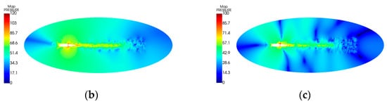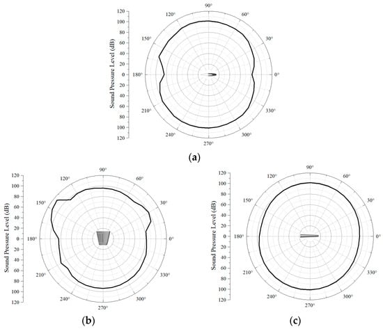 The RNL values at 5 m/s from the monitoring points positioned in a far-field configuration were extracted and depicted as directivity curves in Figure 22. In this way, the noise radiation in various directions surrounding the fin and rudder can be observed directly [].