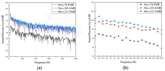 Upon examining the figure, it can be seen that at high flow velocities, the magnitude of the sound pressure level is greater than that at low flow velocities. As the frequency increases, the RNL of flow-induced noise gradually decreases. This is consistent with the observed trends in the variations in pressure fluctuations at different flow velocities, as described above. In Figure 23b, the change in the sound pressure level of flow-induced noise is more clearly presented by the third-octave frequency.